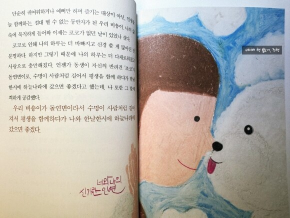 특히 책의 글귀 중 우리 반려견이 돌연변이라서 수명이 사람처럼 길어져서 평생을 함께하다가 나와 한날한시에 하늘나라에 갔으면 좋겠다는 문구가 오래 기억에 남는다.