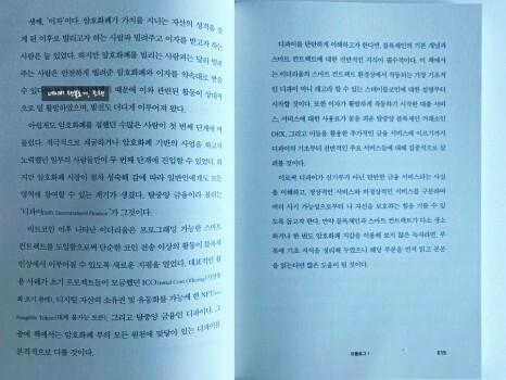 대표적인 활용 사례가 초기 프로젝트들이 모금했던 ICO, 디지털 자산의 소유권 및 유동화를 가능케 한 NFT, 그리고 탈중화 금융인 디파이라며 그중에 책에서는 암호화폐 부의 모든 원천에 맞닿아 있는 디파이를 본격적으로 다룰 것이라고 소개한다.