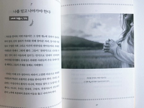 책은 1장 내 생각을 믿고 용감하게 나아가자부터 4장 동정받거나 구걸하지 말고 홀로 서라까지 총 4개의 장으로 이루어져 있으며 총 81개의 소주제, 약 170페이지로 이루어져 있어 가볍게 느낄 수 있었다.