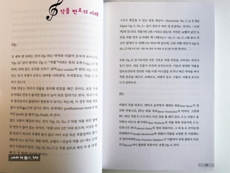 많은 사람이 헷갈려 하는 것이 Op.10, No.3처럼 작품 번호 옆에 또 번호가 붙어 있는데, 작품 10의 3번이라 읽으며 이것은 작품 번호가 하나의 곡에만 붙지 않고 여러 곡을 모은 작품집에도 붙기 때문에 쓰는 표기라고 알려준다.