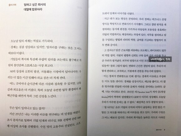 프롤로그와 같은 들어가며 장을 통해 저자 본인은 지난 25년간 일어난 이슈를 연구하는 데 인생을 바쳐왔으며 조사 분석가로 일하며 기업 인재와 리더십, HR 관행에 관한 100개 이상의 조사를 진행해왔고 수천 명의 고용주와 컨설턴트, 소프트웨어 업체와 이야기를 나눴다고 설명한다. 저자는 우리 경제는 비즈니스 운영방식을 혁명적으로 변화시키기 시작했고 경영 원칙을 재정의하는 동시에 환경을 지키거나 다양성과 포용성을 옹호하는 기업의 역할까지도 재정의하는 과정에 있으며 직무를 정의하고 팀을 구성하는 방법과 리더의 역할, 급여를 지급하는 방법까지 모두 변화 중이라고 한다.