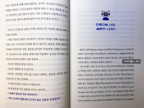 프롤로그를 통해 저자는 질문의 힘, 그 가치를 알고 회복하기 위한 구체적인 노력이 필요하며 질문법이야말로 인공지능 시대에 인간의 차별성을 결정짓는 핵심 역량이라는 것이다. 그것은 그 무엇으로도 대신할 수 없으며 우리가 앞으로 기울여야 할 그 어떤 노력도 질문 역량 강화 없이는 차이를 만들어갈 수 없다는 설명이다.