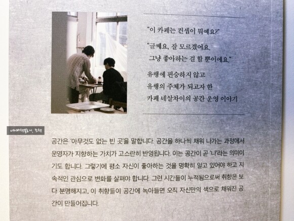 프롤로그를 통해 책을 집필하게 된 이유를 밝히는데, 조금은 다른 운영 방법, 메뉴 등 공간을 만들어 가는 과정에서 작가들은 어떠한 이유로 지금의 모습으로 변화하고 다듬어져 왔는지 그에 대한 이야기들을 담아 보고자 했다는 것이다.
