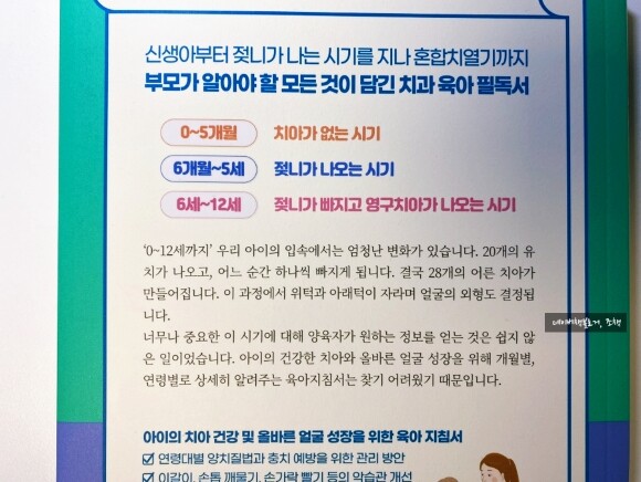 프롤로그를 통해 이 책을 집필하게 된 이유와 목적을 밝히고 있는데, 예방의학을 공부하며 아이들의 교육과 예방이 중요하다는 것을 점점 느끼게 되었고 양육자에 의해 결정되는 것을 알게 되었으며 결국 가장 이상적인 예방은 예비 부모에서부터 시작한다는 것이다. 임신기, 신생아 출산, 그리고 생후 개월별 필요한 치과 정보들이 많이 있으며 입안 속과 얼굴의 변화가 만 12세까지 이어진다는 것이다.