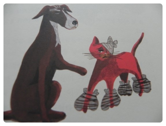 빨간 고양이, 짱>의 표지에는 한쪽 귀를 붕대로 감은 빨간 고양이가 등장해요.