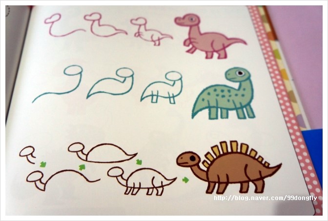 아이들이 꾸준히 연습하고 그리다 보면 여기에서 더 나아가 자기만의 공룡을 창작할 수도 있을 것 같아요.