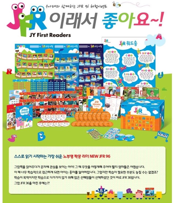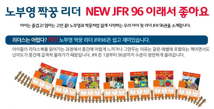 아이가 즐거워야 모든 것이 성공한다지요. 그런 면에서 노부영 짝꿍 리더 New JFR 96은 큰 의미를 갖는답니다. 아이는 즐겁고!! 엄마는 고민 끝!! 쉽고 재미있기 때문에 아이들이 중간에 포기하지 않고.. 끝까지!! 1권부터 96권까지 수준이 완만하게 올라가도록 구성되어 있다고 하네요. 꾸준함을 가능하게 하는 첫 번째 매력이 바로 여기에 숨어 있었네요. |