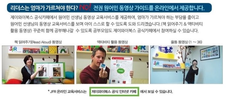 리더스는 엄마가 가르쳐야 한다? No!! ^^ 제이와이북스 공식카페에서 원어민 선생님 동영상 교육서비스를 제공한다고 합니다. 엄마의 부담을 줄이고.. 아이 스스로 교육서비스를 통해 스스로 할 수 있도로고 도와주는 시스템~ 저처럼 영어 교육에 대해 부담감이 있는 분들에게는 정말 최고의 장점이 아닐까 싶어요. 무엇이든 꾸준함이 중요한 것인데, 이번 기회에 제이와이북스 공식카페에 방문해서.. 좀 더 질 높은 영어 학습을 아이에게 시켜줄 수 있을 것 같습니다. |