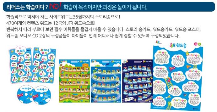 리더스는 학습이 목적이지만 과정은 놀이가 됩니다! 학습적으로 익혀야 하는 사이트워드가 36권까지 스토리송으로 만들어져있다고 하네요. 즐겁게 노래를 배우면.. 저절로 학습이 되는 노부영만의 매력이라지요. 반복해서 따라 부르다보면 필수 어휘들을 즐겁게 배울 수 있는 특별함이 숨어있는 노부영 리더 New JFR 96!! 스토리송카드, 워드송카드, 워드송 포스터, 워드송 오디오 CD 등으로 구성되어 아이들이 언제 어디서나 쉽게 접할 수 있도록 체계적으로 구성되었답니다. 언제 어디서나! 역시 꼼꼼한 노부영이었네요. |