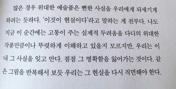 가장 가까운 사람을 잃은 상실감은 정말 클 것 같다. 그 상실감을 회복할 수 있는 방법은 무엇일까. 이번에 읽어 본 책< 나는 메트로폴리탄 미술관의 경비원입니다> 저자 패트릭 브링리는 가장 가까운 가족인 형을 잃은 상실감을 회복하며 쓴 책이다.형은 항상 멋졌던 존재였다. 똑똑하고 다방면에서 잘했던 형이기에 학교에서는 항상 네가 누구 동생이니?라는 말을 들을 정도로 그 말이 익숙해져 버렸기에 동생은 형에 대한 자격지심도 있을 법한데 그런 거 없이 형에 대한 애정이 가득하다.그래서일까 형과 동생의 우애는 깊었고 평생 우애 깊게 지낼 줄 알았던 형이 병으로 삶을 달리하게 되었다.나이가 들어 죽은 것이 아닌 젊었을 때 죽은 형의 빈자리가 컸기에 동생은 그 빈자리의 슬픔을 극복해 내기 위해 메트로폴리탄 미술관 경비원으로 근무하게 된다. 이 미술관에서의 경비원으로서 근무기가 우여곡절이 많을까 싶었는데 우여 곡절보다는 그림으로 치유되는 그의 변화가 눈에 들어온다.그림을 보는 방법을 몰라 전시회를 가본 적이 없다. 하지만 이 책을 통해 그림을 어떻게 봐야 하는 지가 눈에 들어온다. 단순히 미술관 경비로서 미술품 관리와 미술관을 지키는 일이 아닌 미술관에 전시된 작품을 보며 그가 보는 관점을 표현하는 것이 어찌 보면 마음을 정리하고 회복하는 하나의 수단이었던 것이 아니었나 싶었다.메트로폴리탄 미술관에 가본 적이 없지만 이 책을 보면 미술관을 다녀온 것 같다. 내재적 친밀감이 쌓인듯한 메트로폴리탄 미술관 한번 다녀와 보고 싶다.출판사로부터 책만을 제공받아 작성한 서평입니다.