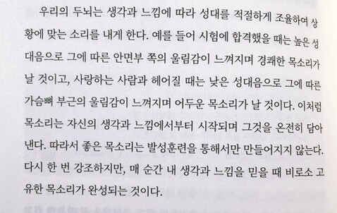 스피치 과외를 받으려면 보통 몇십만 원을 들여야 함에도 이 책 한 권으로 그 스피치 강의의 대부분이 적혀 있어 저렴하게 배울 수 있는 책이지 않을까 싶다. 당당한 말하기에 앞서 배울 여러 가지 것들인 기본 발음, 억양, 톤, 생각을 알기 쉽게 그리고 연습해 볼 수 있게 짜여 있어서 따라 하기만 하면 나도 변화가 있겠다 싶었다.