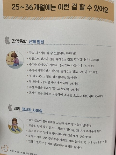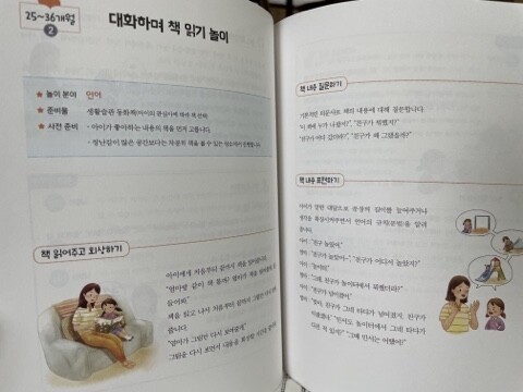 25~36개월에는 이런 걸 할 수 있어요 25~36개월에 이런 점이 궁금해요 25~36개월 이 놀이를 추천하는 이유 25~36개월 이렇게 놀아주세요 25~36개월 놀이 확장하기 25~36개월 놀이 도와주기 [칼럼] 아이가 책 읽기를 좋아하게 만드는 방법 4가지 | 1. 왜? 어떻게? 퀴즈 놀이 _ 게임 방법 설명하기|생활 퀴즈 내기|단서 제공하기 2. 따라 하기 놀이 _ 듣고 지시 따라 하기|행동 보고 표현하기|사진 보고 이야기하기 ㆍ 발음이 제법 또렷해요 3. ‘ㅂ’ 소리 놀이 _ 빼빼로 입술 물기|요플레 립스틱 바르기|입술 도장 찍기|입술 폭죽 날리기 4. ‘ㅅ’ 소리 놀이 _ 소리내기 연습하기|낱말과 문장 연습하기|자발화 연습하기 ㆍ 또래와 사이좋게 어울려요 5. 스티커 뽀뽀 놀이 _ 놀이 규칙 이해하기|같은 곳에 스티커 붙이기|스티커에 뽀뽀하고 떼어 내기 6. 동서남북 놀이 _ 동서남북 종이접기|동서남북 놀이 규칙 익히기 ㆍ 역할놀이를 시작해요 7. 미용실 놀이 _ 휴지심으로 손님 만들기|미용사 되기|싹뚝싹뚝 머리카락 자르기 8. 가게 놀이 _ 가게 꾸미기|가게 주인 되기|손님 되기 ㆍ 장애물을 통과할 수 있어요 9. 마스킹 테이프 놀이 _ 마스킹 테이프 길 건너가기|마스킹 테이프 과녁 맞추기|춤추다가 원으로 들어가기 10. 장애물 탈출 놀이 _ 게임 재료 구하기|장애물 구성하기|장애물 건너기