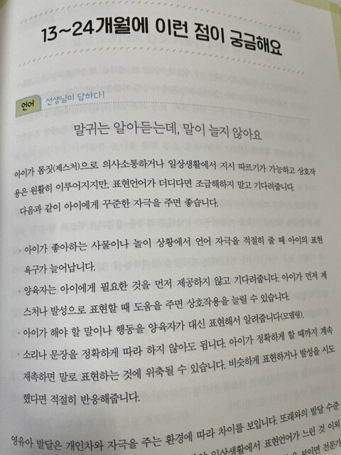 13~24개월에는 이런 걸 할 수 있어요 13~24개월에 이런 점이 궁금해요 13~24개월 이 놀이를 추천하는 이유 13~24개월 이렇게 놀아주세요 13~24개월 놀이 도와주기 [칼럼] 행복한 놀이를 위해 양육자가 알아야 할 것 / 생후 24개월까지 ‘감각운동기’라고 불리는 이유 | 1. 요리사 놀이 _ 요리 재료 선택하기|동작어 표현하기|크기와 위치 표현하기|요리 과정 생각하기 2. 대화하며 책 읽기 놀이 _ 책 읽어주고 회상하기|책 내용 질문하기|책 내용 표현하기 ㆍ 어린이집 일을 말해요 3. 달력 만들기 놀이 _ ‘오늘’ 시간 이해하기|‘어제’ 시간 이해하기|‘내일’ 시간 이해하기 4. 엄마랑 대화하기 놀이 _ 그날 일 질문하기|활동시간 질문하기|대화 확장하기|언어 확장하기 ㆍ 자기주장이 강해져요 5. 몸 만들기 놀이 _ 내 몸 따라 그리기|내 몸 조각하기|내 몸의 길이 재보기 6. 내 것 만들기 놀이 _ 좋아하는 것 탐색하기|내 책 만들기|내 가방 만들기 ㆍ 감정을 표현해요 7. 마음 알기 놀이 _ 다양한 표정 찾고 지어보기|오늘의 기분 표현하기|일상 속 감정 나누기 8. 마음 표현하기 놀이 _ 풍선으로 마음 표현하기|신문지로 마음 표현하기|뻥튀기로 마음 표현하기 ㆍ 손 근육이 발달해요 9. 휴지심에 실 끼우기 놀이 _ 휴지심 고리 끼우기|휴지심 실 끼우기|휴지심 터널에 실 끼우기 10. 친구 구하기 놀이 _ 가위질 연습하기|종이에 묶인 장난감 구하기|상자에 갇힌 장난감 구하기