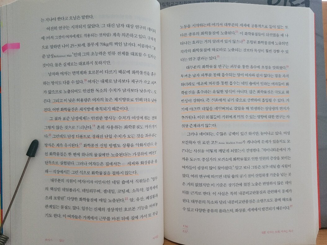 버지니아 울프의 『자기만의 방』과 미슐레의 『마녀』를 읽었다. 그 이후로는 더 이상 서가를 채우지 않았다. 아예 치워 버렸다. 서가를 갖추겠다는 생각 자체를 버렸다. 이제 끝났다. 그 두 권의 책을 통해 나 자신의 몸과 머리를 열고, 중세의 숲속과 19세기의 공장에서 사는 나의 삶을 읽었던 듯하다. 아직까지 울프의 책을 읽은 남자를 본 적이 없다. MD 가 소설 속에서 말하듯이, 여자와 남자는 완전히 다르다. - P60
