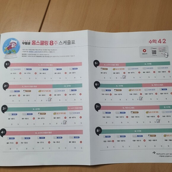 일단 홈스쿨링을 할 수 있도록 앞에 스케줄표가 있고, 개념정리는 동영상으로 만들어져 있어서 딱이더라구요. 지금까지 수학은 과외를 하고 있었는데, 숙제를 하기 싫어해서 넘 힘들었는데, 단원마다 짧은 동영상으로 개념설명을 해주니, 홈스쿨링 하는 엄마의 일을 덜어주는 듯 하더라구요.