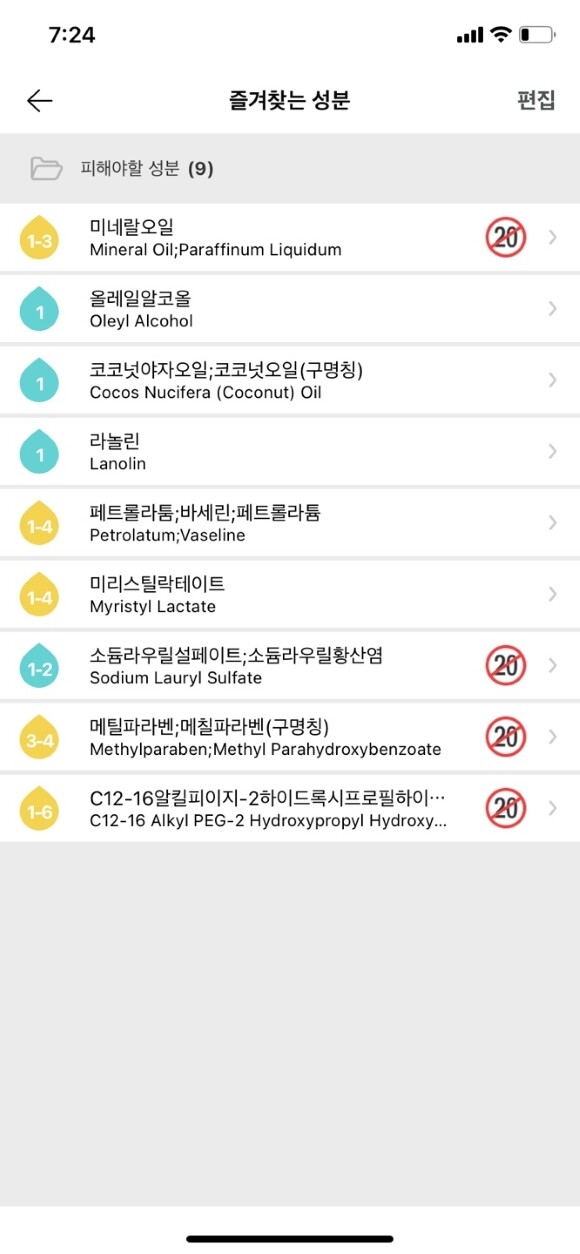 화장품 구매시 화해 어플을 많이 참고 하는 편인데, 책을 읽고 나서 내가 사용하고 있는 기존 화장품의 성분을 체크하고 '마이페이지'에서 '피해야할 성분' 폴더를 따로 만들어 유해 성분을 분류 하는 작업을 했다.