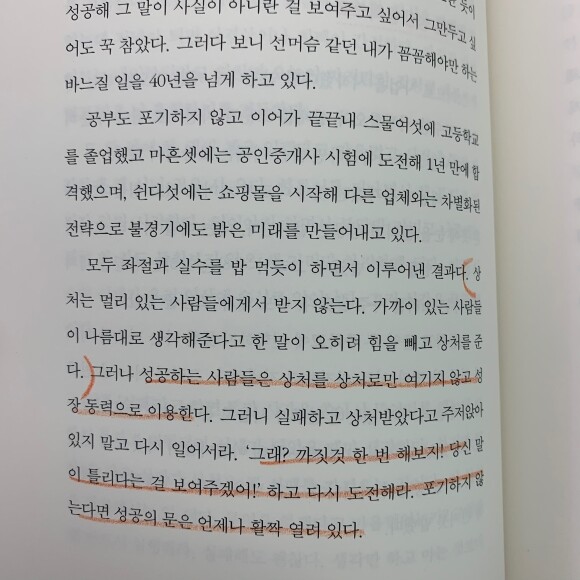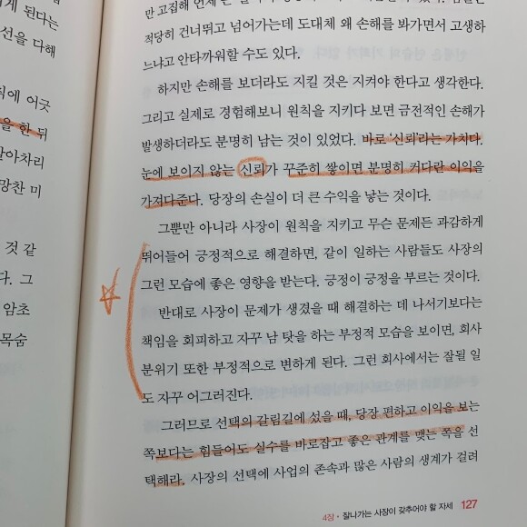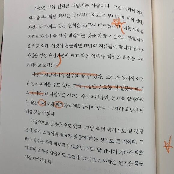 이 책은 마케팅, 영업, 세무 등에 대한 지식을 알려주는 창업 실무서라기 보다는 창업을 시장하는 사장이라면 꼭 가져야 할 마음가짐과 버려야 할 태도를 알려주는 자기계발 서적이다. 사업을 시작하기 전 #예비창업자 라면 이 책은 사장이 가야할 방향을 알려주는 지도가 될 수 있고, 사업을 이미 하고 있는 사장들에겐 무수한 장애물들로 지친 마음을 응원하고 위로하는 책이 될 것 같다.
