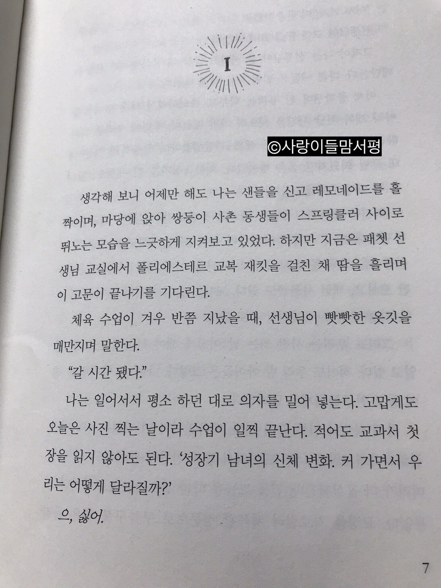 P7  "생각해보니 어제만 해도 나는 샌들을 신고 레모네이드를 홀짝이며, 마당에 앉아 쌍둥이 사촌 동생들이 스프링클러 사이로 뛰노는 모습을 느긋하게 지켜보고 있었다. 하지만 지금은 패쳇 선생님 교실에서 폴리에스테르 교복 재킷을 걸친 채 땀을 흘리며 이 고문이끝나기를 기다린다....
