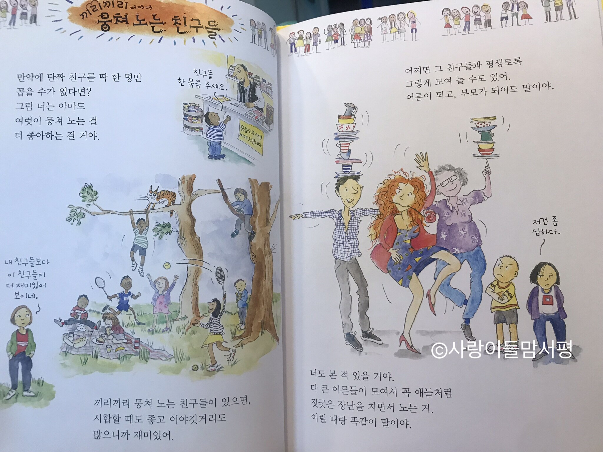 친구란 무엇일까?! 부터 친구사귀기, 단짝 친구, 끼리끼리 뭉쳐노는 친구들~ (ㅋㅋㅋ 다 큰 어른들이 모여서 꼭 애들처럼 짖꿎은 장난을 치면서 노는 거, 어릴 때랑 똑같이 말이야. ㅋㅋㅋㅋㅋㅋ 너무웃겨요. ㅋㅋㅋㅋ) 글 그림 너무 깨알 웃음이 피식피식~ ㅋㅋㅋ