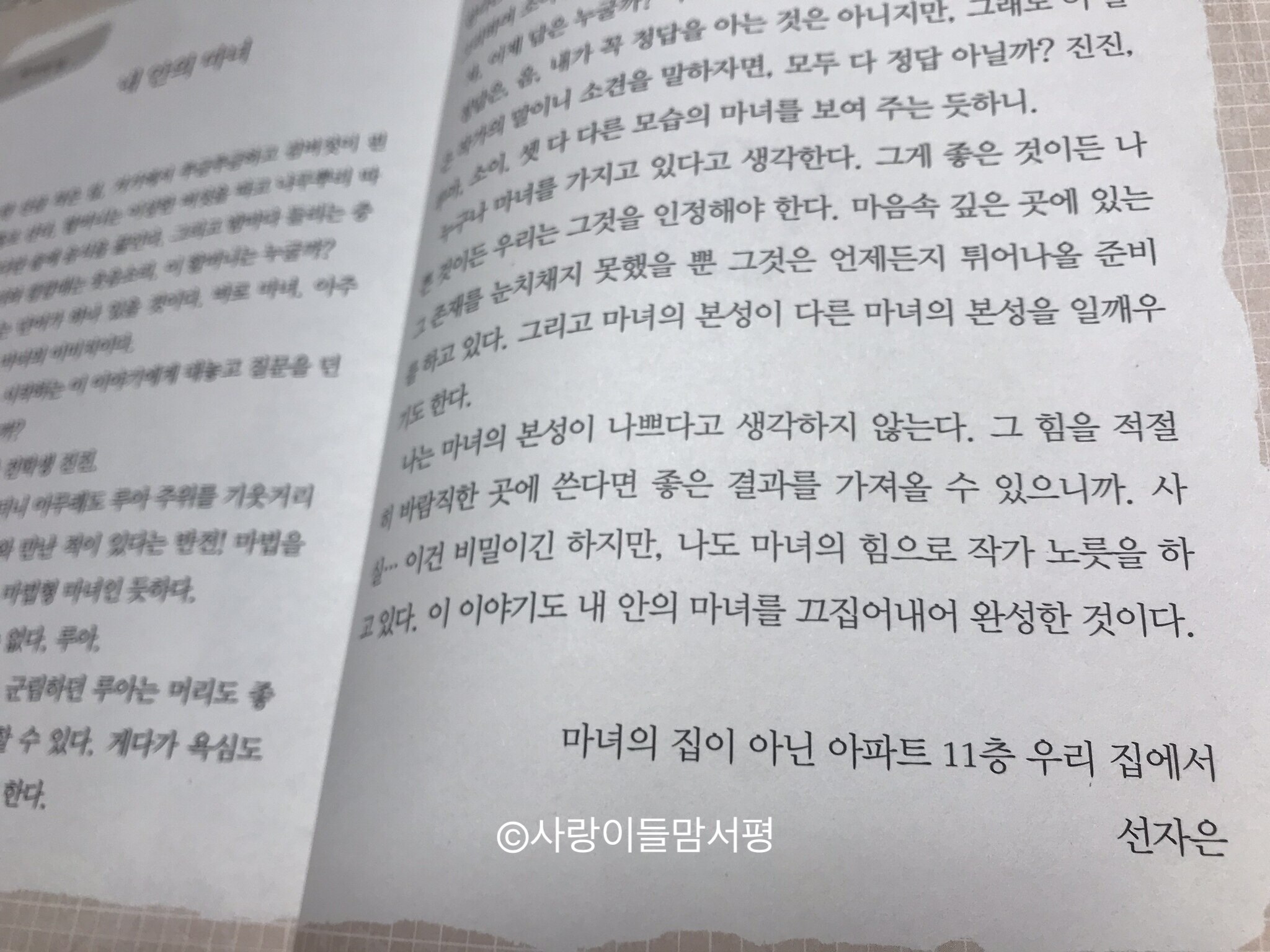 “누구나 마녀를 가지고 있다고 생각한다. 그게 좋은 것이든 나쁜 것이든 우리는 그것을 인정해야 한다. 마음속 깊은 곳이 있는 그 존재를 눈치채지 못했을 뿐 그것은 언제든지 튀어나올 준비를 하고 있다. 그리고 마녀의 본성이 다른 마녀의 본성을 일깨우기도 한다.” - 작가의 말 중에서