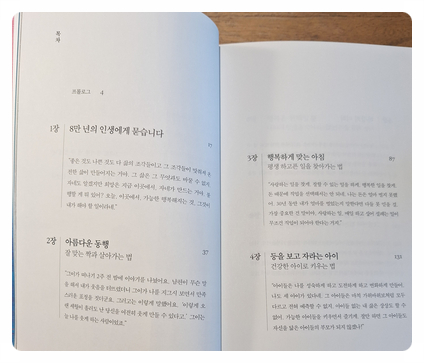 이 책은 코넬 대학교 인류 유산 프로젝트의 일환으로 만들어진 책이다. 저자인 칼 필레머 교수가 5년에 걸쳐 1000명이 넘는 70세 이상의 각계각층을 대상으로 다양한 질문과 인터뷰를 해서 모은 이야기이다. 이 책은 오랫동안 베스트셀러이기도 해서, 이번 서평단 신청으로 받은 책은 무려 50쇄 기념 리커버리 판이다. 이 책을 예전에 한번 읽고 좋다고 생각해서 주변 지인에게 선물로 준 적이 있는데, 이번 기회에 다시 받아 읽어볼 수 있게 되어서 너무 좋았다.