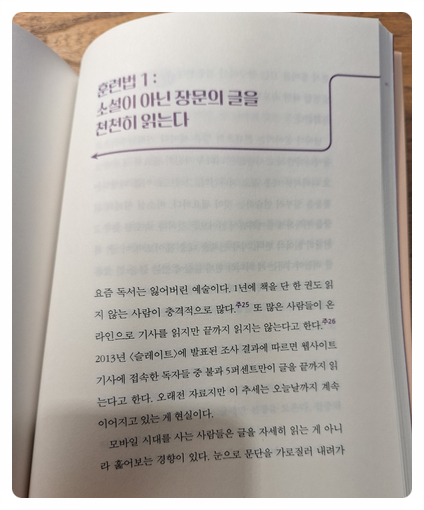 저자는 5부에서 몰입에 도움을 주는 10가지 훈련법을 알려주고 있다. 실제적인 실천 방법과 실천에 필요한 소요시간도 알려주어서 시도해볼 수 있도록 도와주고 있다. 10분정도를 투자하면 시도해 볼 수 있는 훈련법들을 소개하고 있어서 해보았다. 소설이 아닌 글을 천천히 읽어보기, 깊게 심호흡하기도 있다. 디지털 디톡스도 그 중 하나인데 쉽지 않지만 5분, 10분 씩 시간을 늘려서라도 연습해보아야겠다. 생각하지 않고, 몸이 알아서 할 수 있는 단계로 들어가면 좋겠다.
