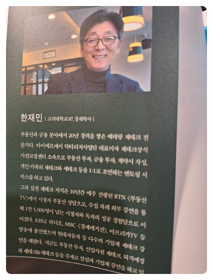 책의 저자인 한재민님은 부동산과 금융 분야에서 20 경력을 쌓은 베테랑 재테크 전문가다현재에는 부동산 투자금융투자개인,가족의 재테크 등을 1:1 조언하는 멘토링 서비스를 운영하면서다수 방송 출연과 기업체 재테크 강연도 해왔다고 한다.