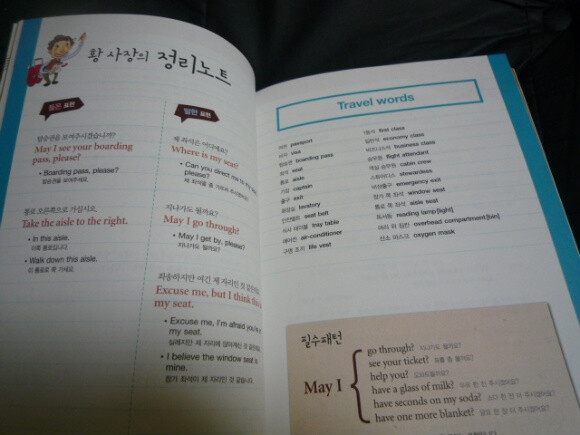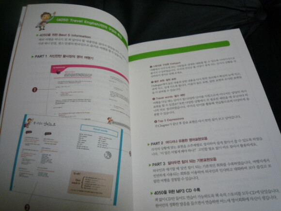 <4050 Travel English 술술 읽히는 여행영어회화> 1. 책표지: 아담한 사이즈로 깔끔한 표지에요^^ 갖고다니면서 휴대하기도 편할것같아요~ 여행다니면서 바로바로 볼수있고~ 2. 책속의 구성 1) 자신만만 황사장의 영어 여행기, 황사장의 정리노트 - 여행에서 마주치게 되는 사람들과의 스토리로 구성된 대화지문으로 정리되어있어 여행가서 실용적으로 써먹기 매우 유용한 표현들 위주. - 대화지문에서 듣고 말한 내용을 다시 정리해서 반복훈련으로 귀와 입에 착 달라붙어 익숙하게 해주는 연습^^ - 여행시 많이 쓰이는 단어와 어휘들. 필수패턴이 매유닛마다 정리되 있어서 다양하게 응용할수있게 구성^^ 2) 어디서나 유용한 영어표현모음 여행갈때 각각 상황에 맞는 표현을 주제별로 정리해놔서 쉽게 찾아서 실제로 여행가서 들고다니며 바로바로 찾아서 써먹을수있게 편하게 정리되있어요^^ 3) 알아두면 힘이 되는 기본표현모음 외국인과 대화할 일이 생겼을때 알아두면 많은 도움이 되는 기본회화표현들이 수록되어있어요~ 아무래도 여행가면 급하게 문장이 생각안날때가 많은데, 찾아보기도 쉽고 깔끔하게 정리되어있어서 도움이 많이 될것같습니다. ^^ 4) 원어민발음으로 녹음된 MP# CD 수록 - 책에 있는 대화들을 귀로 들으면서 영어발음을 제대로 익히며 공부할수있고,원어민발음을 들으며 연습하기때문에 영어회화에 자신감을 심어줍니다^^ 3. 이책의 장점 책이름이 4050 이어서 나이있으신분들의 여행회화책인것같아보이지만, 대부분의 학생들도 막상 해외로 나가보면 원어민들과 영어로 대화할 상황이 닥치면 쉬운 대화문장도 쉽게 떠오르지않고 말하기 쉽지 않은 경험들을 많이 하게되는데, 이책은 해외여행을 떠나는 사람이라면 누구에게든 필수표현 기본표현들이 보기 편리하게 알짜배기 표현들이 정리되어있는 여행회화책이라 매우 도움이 많이 될것같습니다. 추천합니다^^