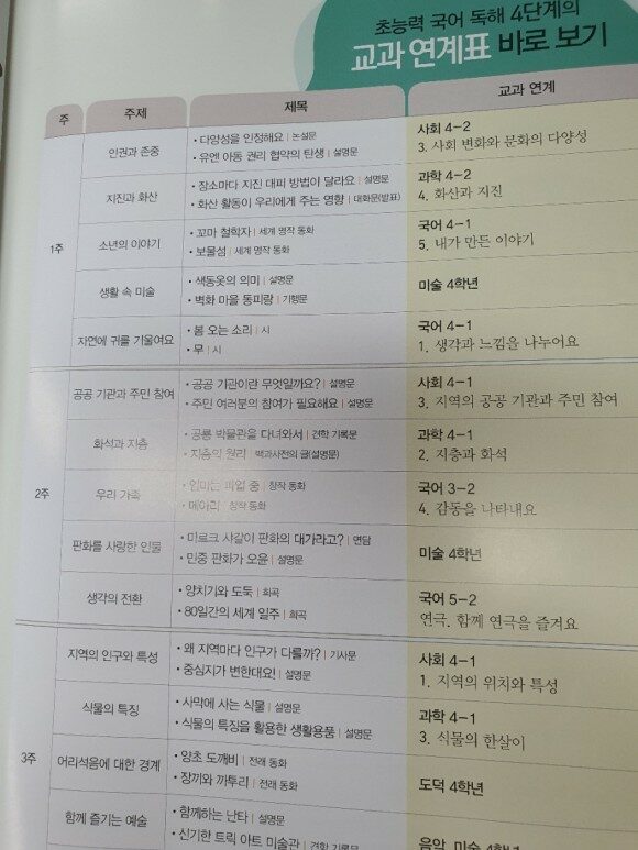 총 6주로 나누어 있어서 지금부터 하면 여름방학에도 자연스럽게 이어서 학습할 수 있어요. 사회, 과학, 국어 , 미술등 다양한 분야의 지문에 제공되고, 교과 연계표를 보면서 공부하니 학습의욕이 더 향상되는 것 같아요.