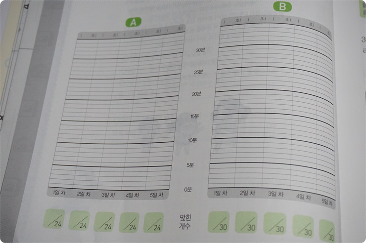 스스로 학습 관리를 위해서 매일 맞힌 개수를 적고 걸린 시간만큼 색칠을 하는