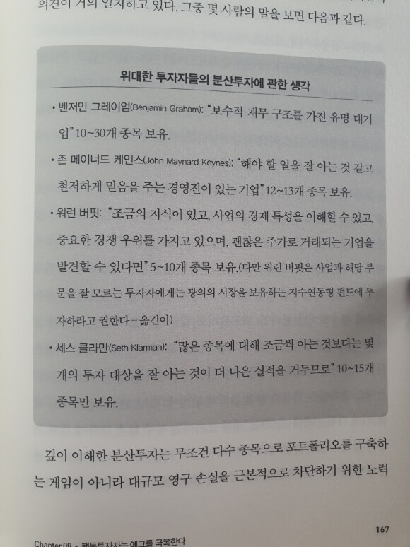 ; 억만장자 투자자 조엘 그린블라트Joel Greenblatt도 《주식시장의 보물찾기You Can Be a Stock Market Genius》에서 분산 가능 위험인 비시장 위험nonmarket risk은 단 2개의 종목만 보유해도 46%가 줄어들고, 4개 종목을 보유하면 72%, 8개 종목은 81%, 16개 종목을 보유하면 93%가 줄어든다고 말했다. 166p