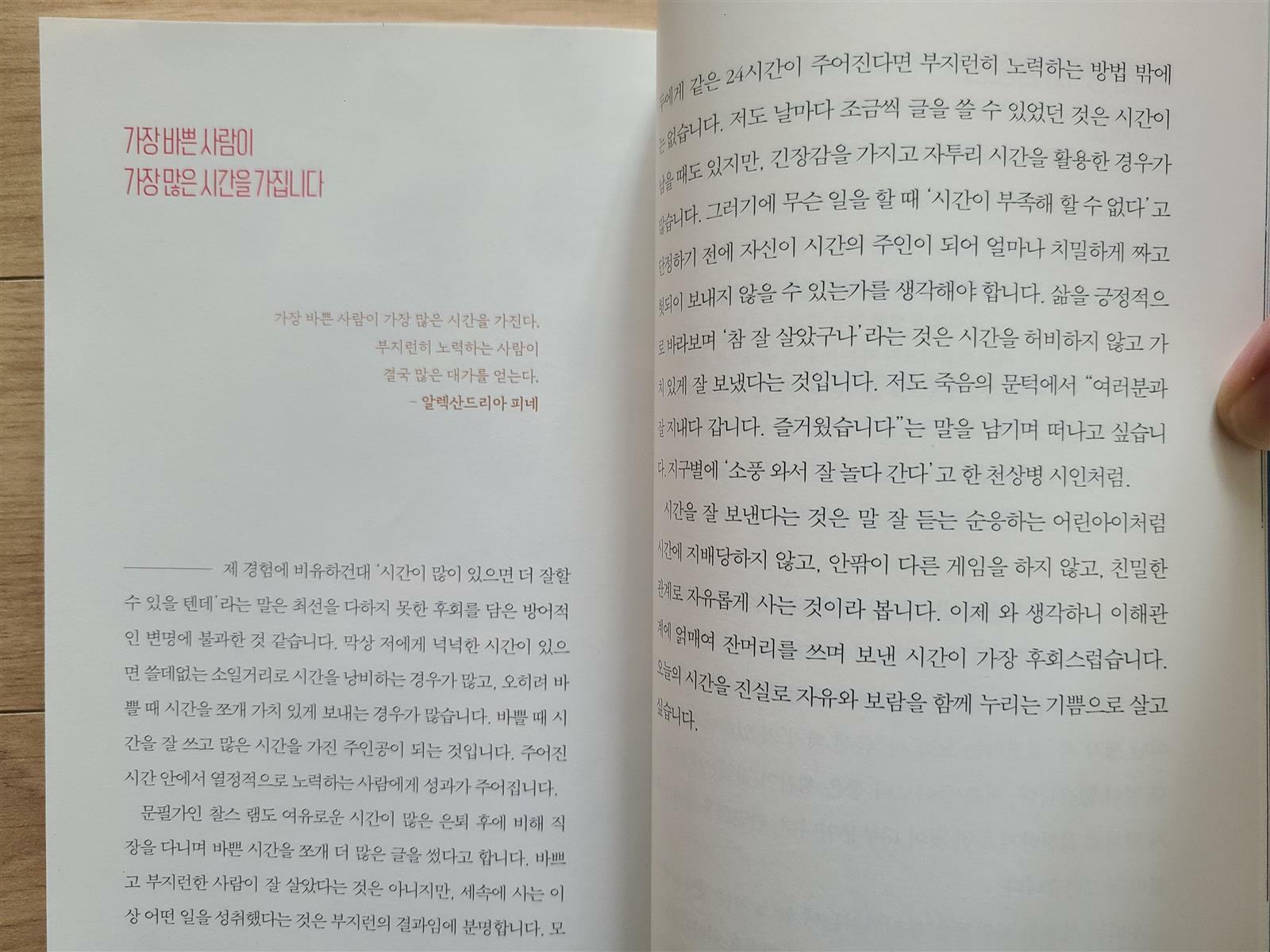자신이 원하는 일을 이루었다면 축하할 일이지만 그렇지 않다면 오늘은 자신이 진정으로 원했고, 지금도 원하는 것이 무엇인지를 생각하고 용기 있게 착수하시길 바랍니다. 시작은 절대 늦는 법은 없습니다. 가치 있는 삶을 위해 파이팅합시다! - page 121