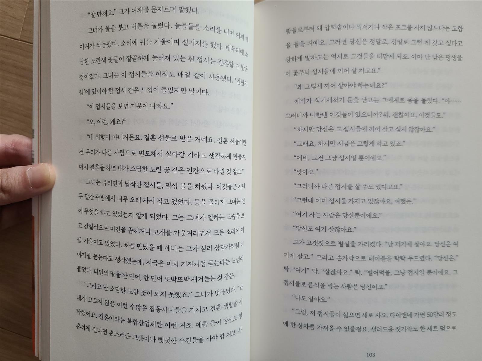 "난 왜 당신이 모든 문제를 감당하려고 드는지 모르겠어요. 어머니는 본인이 기다리고 싶을 때 기다리고, 연락하고 싶을 때 연락하는데 왜 당신은 무조건 맞춰주기만 하는 거죠? 딸이니까요? 하지만 영원히 이렇게 지낼 순 없어요." - page 361
