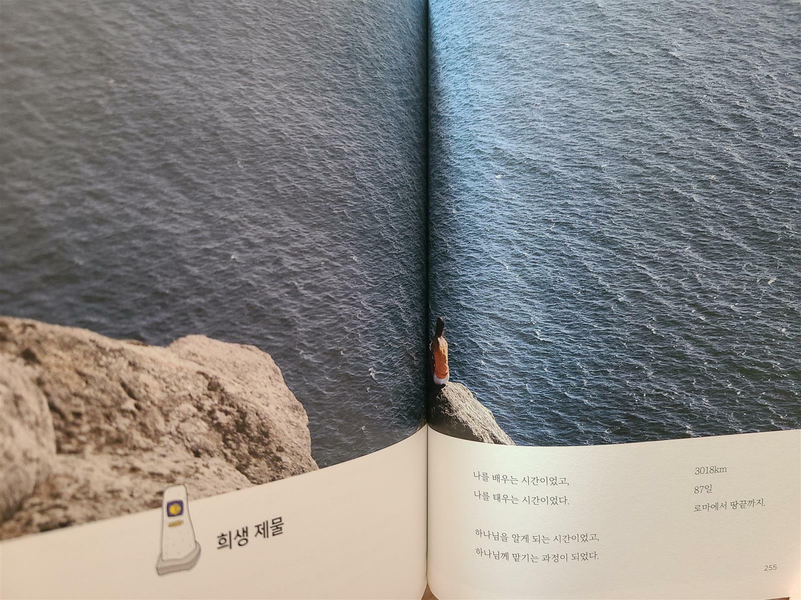 주님이 가셨던 그 길로 우리를 초대하셨다. 그 길이 바로 십자가의 길이며 (마 16:24), 희생제물이 되는 길이며 (롬 12:1), 이방인을 제물로 바치는 제사장의 길이다 (롬 15:16), 로마에서 피니스테라까지, 총 3018km, 87일의 일상 속 매일 개혁되어지는 예배자로서의 훈련이 지금 시작된다. - page 37
