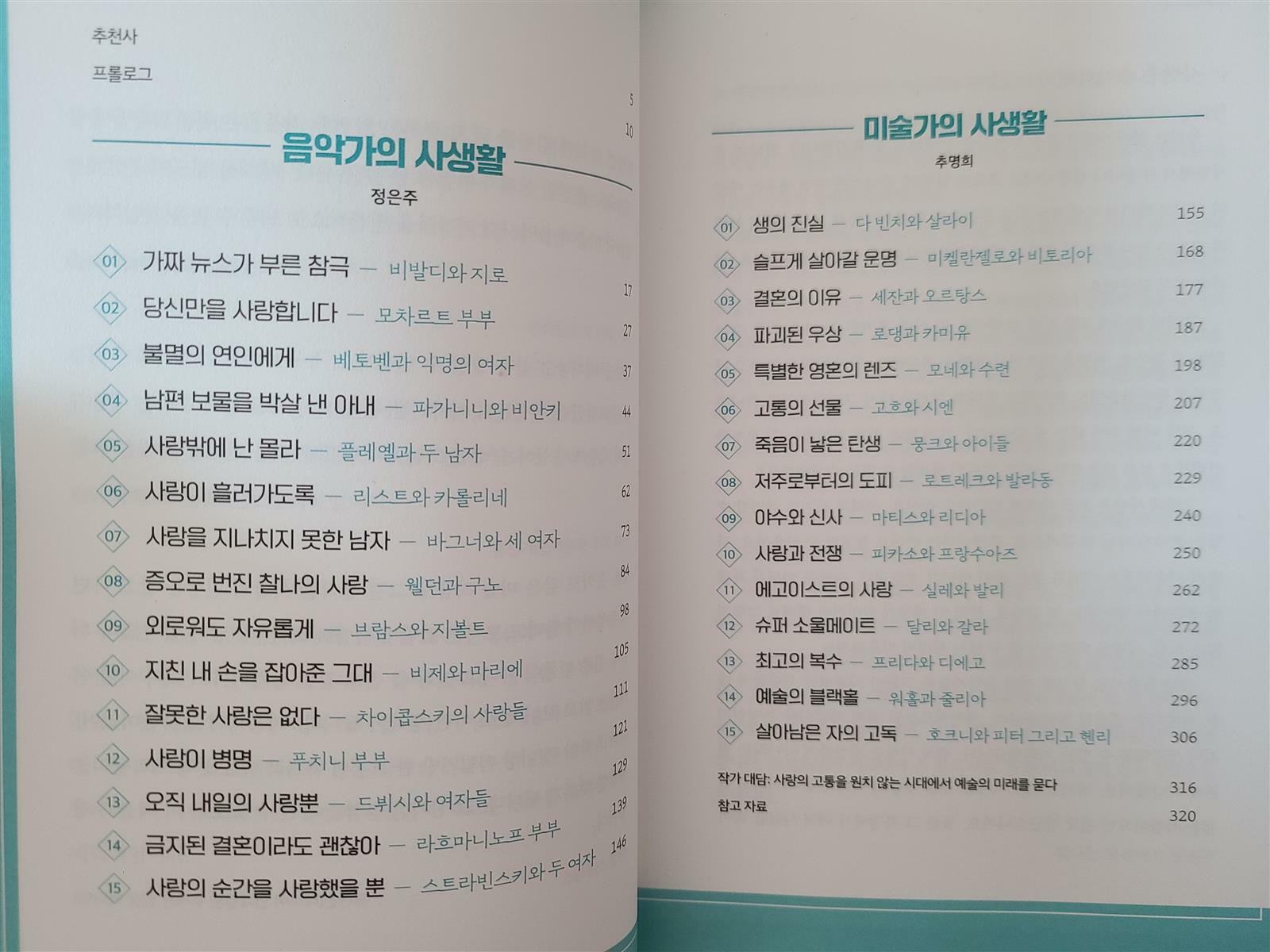 삶을 초과하는 예술은 없다. 그러니 미술도 음악도 모두 예술가의 삶과 밀접하다. 예술을 이해하는 데는 그 시대의 사조를 이해하거나, 전문적인 지식을 가지고 면밀히 작품을 분석하는 방식 등 여러 가지가 있을 테지만, 나는 예술가의 인생을 들여다보는 방식을 택했다. 왜냐면 그렇게 접근했을 때 음악이 주는 감동이 내게는 훨씬 크게 다가왔기 때문이다. - page 5