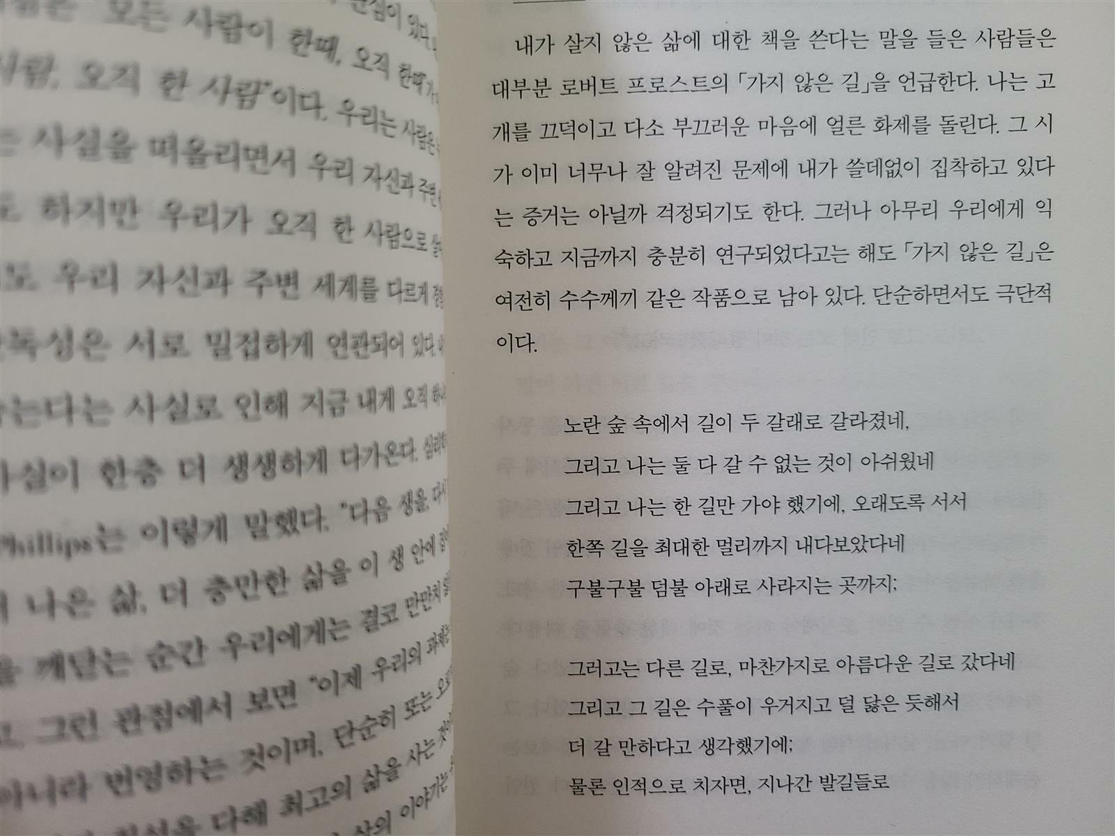 아무튼 가지 않은 길, 살지 않은 삶에 대해 로버트 프로스트부터 샤론 올즈까지, 버지니아 울프에서 이언 매큐언까지 그들의 시, 소설, 영화, 철학, 심리학을 바탕으로 다른 삶을 탐구하며 우리 삶을 되돌아보게끔 해 주었습니다.