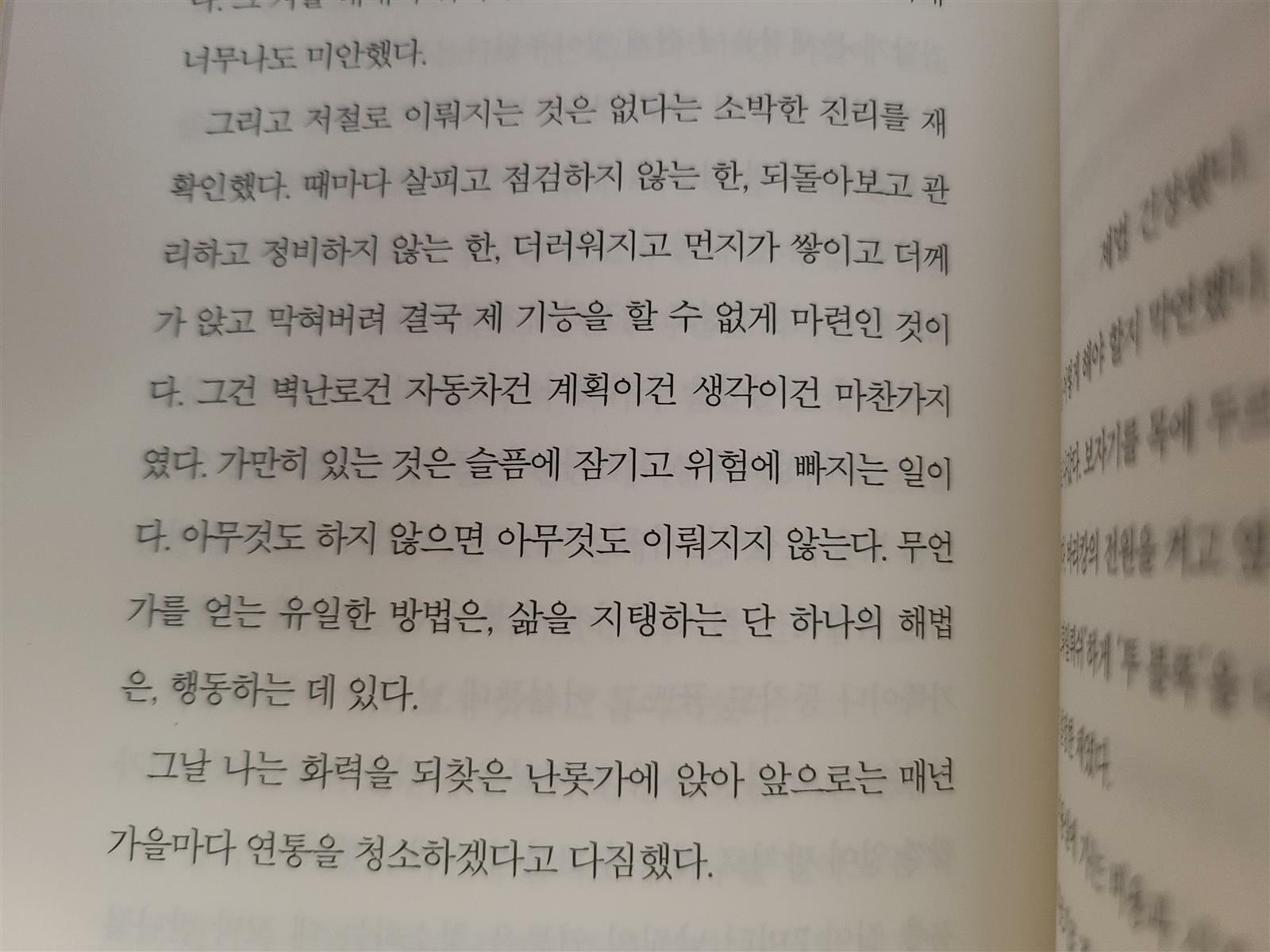 "미뤘으면 못 왔지. 돈이 목적이었으면 돈 때문에 못 왔고, 애 교육이 목적이었으면 그것 때문에 못 왔겠지. 그리고 그때 오지 않았다면 지금처럼 사는 우린 없지. 10년 동안 가평에 살면서 생각이 얼마나 많이 바뀌었는데, 전혀 다른 세계에서 다른 방식으로 살았을 자신이 어떻게 지금과 같았을 거라고 생각해? 더구나 그때 얘가 아팠고 여기서 건강하게 컸다는 걸 잊지 말도록!" - page 26
