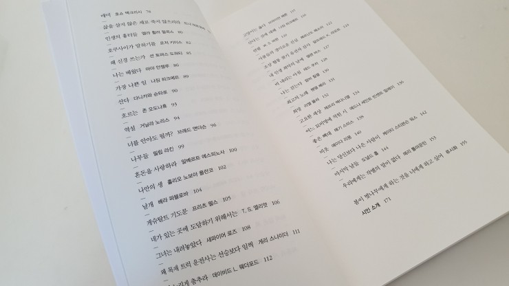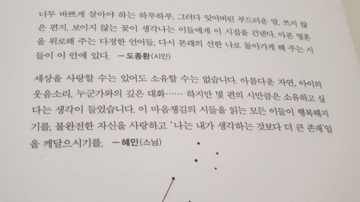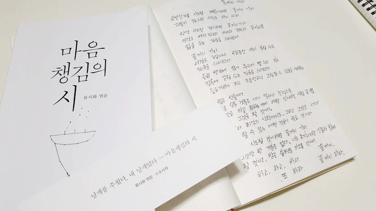 이 책을 엮기 위해 시를 고르고 시 사용을 허락받기 위해 시인과 저작권자, 출판사에 연락을 했다고 한다. 마음챙김을 위한 시를 소개하겠다는 취지에 다들 공감하고 사용을 허락해 주었기에 우리는 '마음챙김의 시'를 만날 수 있게 되었다.