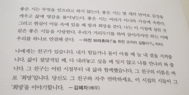"시를 읽는 것은 자기 자신으로 돌아오는 것이고, 세상을 경이롭게 여기는 것이며, 여러 색의 감정을 경험하는 것이다.