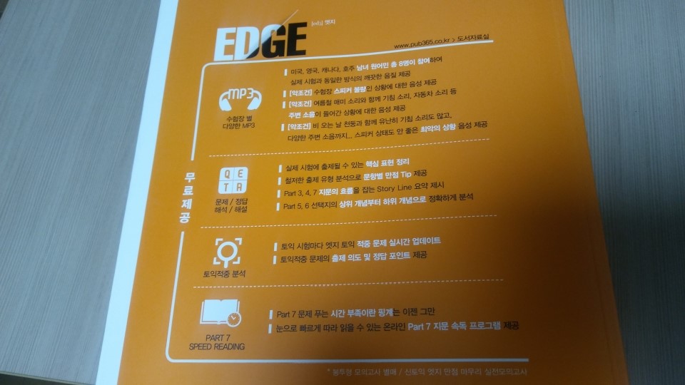 이 책을 보면 장점은 이렇게 설명할 수 있을 것 같다. 시중엔 리딩과 리스닝을 분리해 모의고사책을 엮거나 문법, 단어 중심으로 먼저 세세히 공부하길 추천하는 책들이 많은데 이 책은 리딩, 리스닝 3세트씩 모아놓은 모의고사 책이다. 시험현장에서 문제를 푸는 것과 동일한 환경을 조성할 수 있다. 리스닝 후 바로 리딩문제를 풀어 연속선상에서 1회 시험을 풀어볼 수 있는 것. 글자 포인트도 커서 실제 시험과 비슷한 환경에서 볼 수 있다. 테스트1,2,3을 찾을 때 빨간색으로 구역표시가 돼 있는데 이것도 좋은 것 같다. 눈에 확 띄기 때문.
