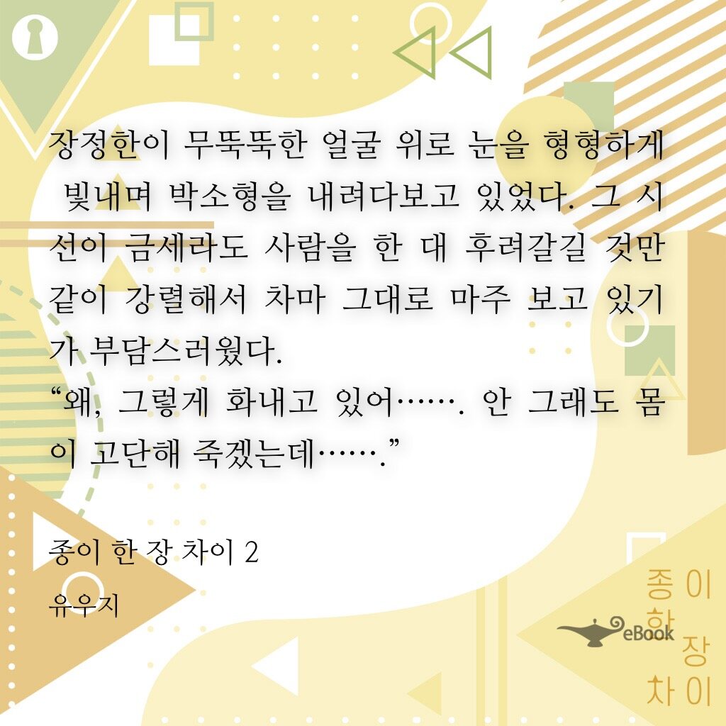 박소형은 애인이라고 사귀던 놈이 도박장을 들락거리다 두 사람이 마련한 집의 전세금까지 가지고 튀는 뒤통수를 맞게 되고 그런 소형을 위로해준다며 친한 선배인 장영한의 연락으로 만나지만 어느 새 영한의 신세 한탄의 장이 되어버린 술자리. 오히려 성격 무던하고 낙천적인 소형은 동생때문에 속상해라는 영한을 다독여주게 되고 그러다 전셋집에서 쫓겨나게 생긴 소형의 사정을 알게 된 영한은 보증금을 빌려주는 조건으로 집안의 골칫덩어리인 장정한의 옆집에 살며 한달에 한 두번 근황을 알려달라고 부탁을하게 됩니다. 그렇게 운 좋게? 집을 구하게 된 소형은 3층짜리 빌라에 들어가 살게되면서 옆집에 사는 장정한과 우연한 계기로 안면을 트게 되고 외모는 게이인 소형의 취향이었지만 밤마다 들려오는 정한의 신음소리에 괴로워합니다. 그러다 바람둥이에 제멋대로인 정한의 복잡한 여자들과의 문제에 휘말려 소형은 한 여자에게 칼에 휘둘리는 사고를 당하게 되고 다친 소형을 보고 화난 정한에게 소형은 자신도 모르게 소형의 맘이 드러나는 소리를 합니다. “나 정말 괜찮아. 너 다치는 것보단 내가 대신 다치는 게 훨 나으니까, 정말로 됐어!” -알라딘 eBook <[BL] 종이 한 장 차이 2> (유우지) 중에서 눈치 빠른 정한은 캐묻게 되고 그걸 계기로 달라지는 두 사람의 관게가 본격적으로 흥미롭게 그려집니다. 정한은 소형과 함께 살기위해 나름의 계획을 가지고 그를 공략하는데 그렇게 능청스럽고 제멋대로인 정한이 성격이 정반대나 마찬가지인 순진한 소형에게 마음이 가게 되면서 변하게 되는 과정도 이 소설의 포인트 중 하나였습니다.