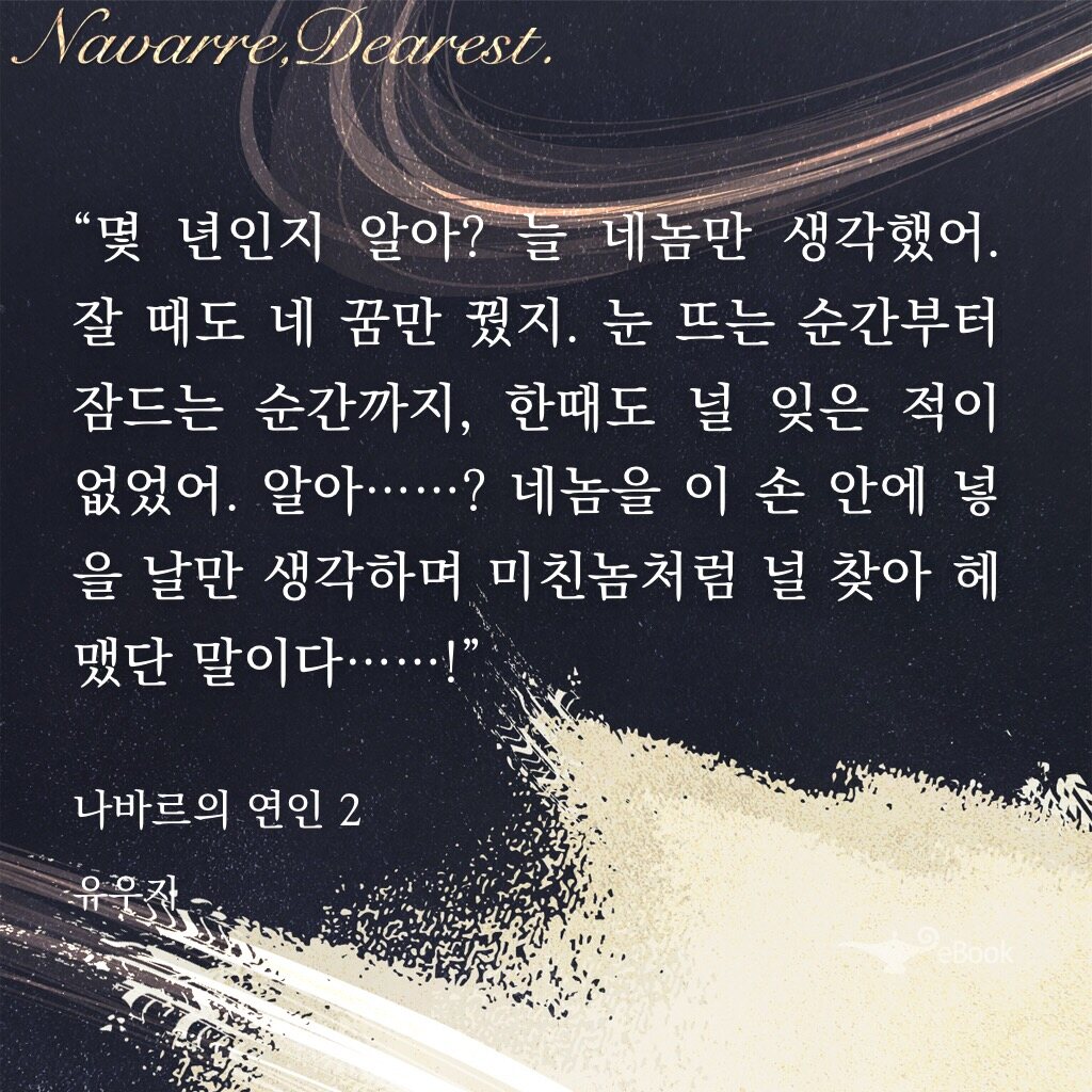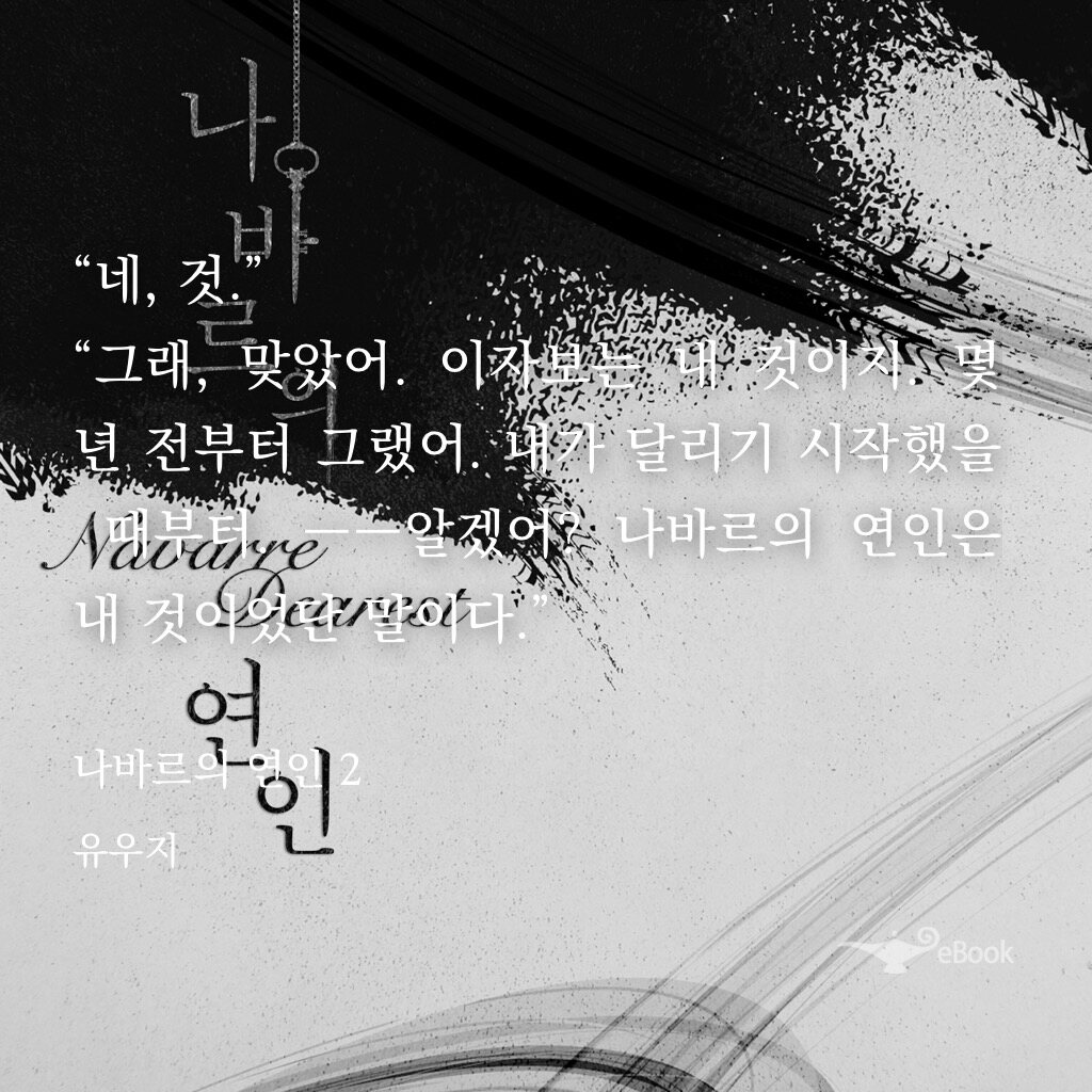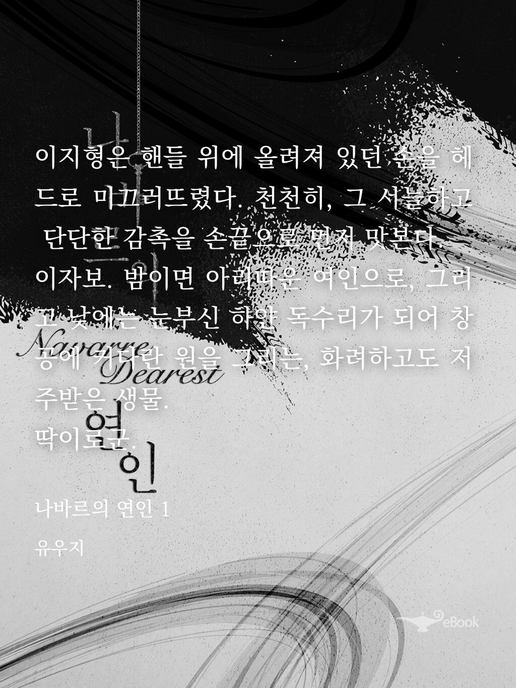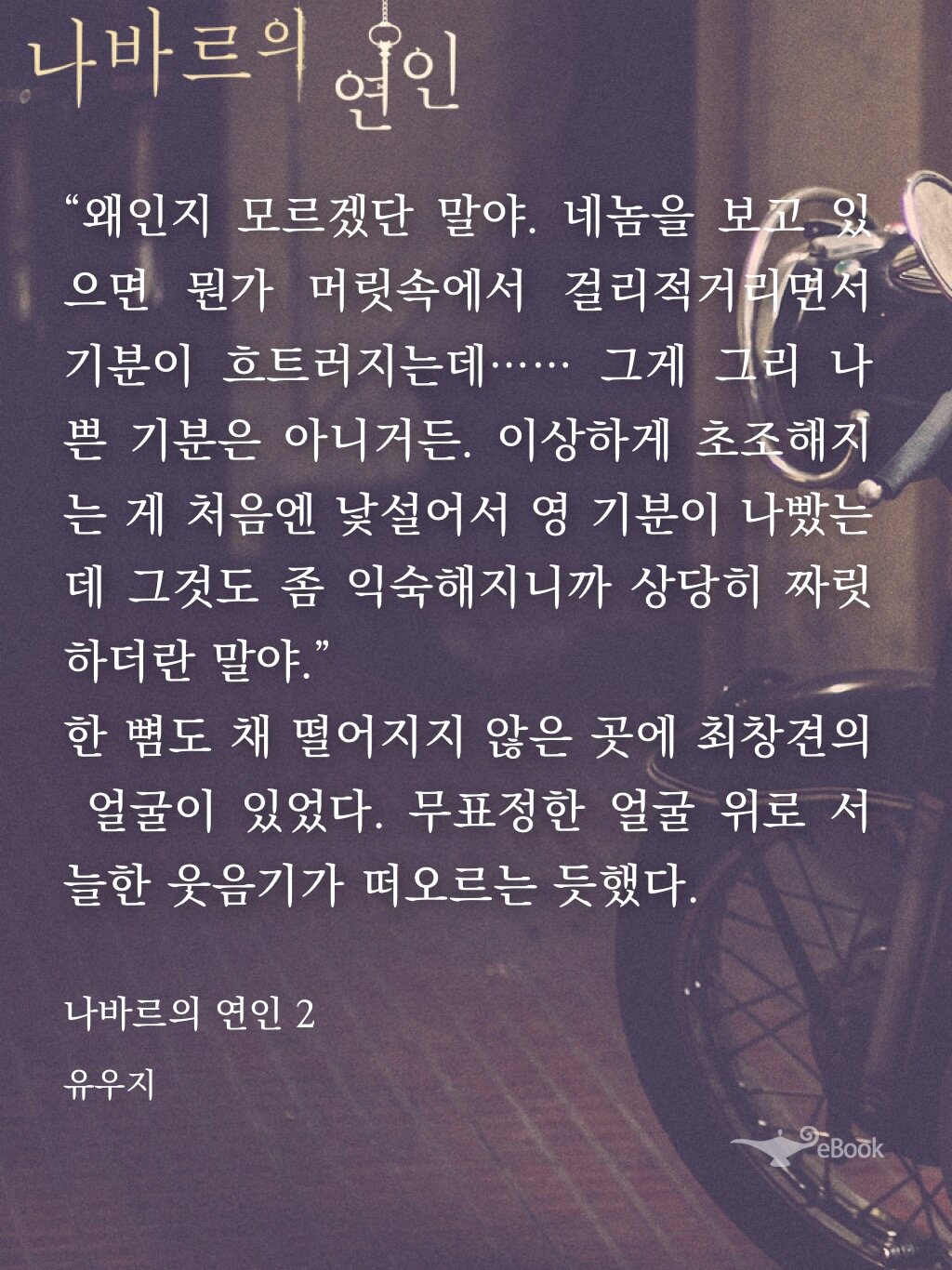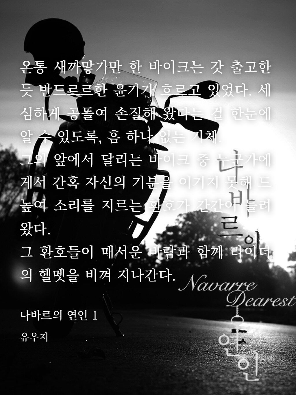 “밤에는 늑대, 낮에는 인간. 다른 쪽은 밤에 인간, 낮에는 매. 안타깝게도 엇갈려서 늘 함께 있되 언제까지고 얼굴을 마주하고 사랑을 나누지 못하는, 가엾은 연인들이지.” 최창견의 숨결이 가빠지고 있었다. -알라딘 eBook <[BL] 나바르의 연인 2> (유우지) 중에서 2004년도에 출간 되었던 유우지님의 작품이 다시 전자책으로 재출간 되었는데 구작인만큼 어느 정도 다듬어져 나왔겠지만 복고풍적인 그때 당시의 감성이 물씬 풍기는 시니컬한 문체들이 전반적으로 소설 속 분위기를 압도하는 작품이었습니다. 이 부분에서 취향이 갈릴듯한 바이크를 매개로 해 최창견과 이지형 두 사람의 감정선과 관계성을 보여주는 작품인지라 그런 요소들이 작품 전체의 느낌을 이끌어 내는데 시작부터 그런 묘사를 보여줍니다. 『오토바이 위에 올라앉아 있는 한, 죽여도 안 죽을 것 같은 놈』 수인 이지형을 일컫는..그리고 그가 애지중지하는 바이크인 나바르.. 광견이란 별명이 있는 최창견 그의 최애인 바이크는 이자보.. 또 다른 별명이 이자보의 연인인데 아무도 손을 못대게 할만큼 바이크에 미쳐있는 녀석 지형이 준옥이 소개 시켜준 단기 고수익 아르바이트에 갔다가 광견이라 불리던 최창견의 사랑스러운 연인 (책에서 이렇게 묘사하고 있습니다ㅎ) 바이크 이자보를 보고 지형이 건들게 되고 자신의 애마를 누군가가 건드는 걸 미치도록 싫어하던 창견에게 들키게 되면서 두 사람은 본격적으로 얽히기 시작합니다. 이랬던 최창견이 이자보에게 보이던 독점욕과 소유욕이 이지형으로 옮겨가며 광속으로 질주하는 광공의 모습을 보이면서 그에게만은 예외적으로 자신의 애마를 만지게 해주고 이지형을 미치도록 찾아해매며 빠져드는 모습을 보여주는데 이러한 점들이 이 소설에서 바이크를 매개로 깊어지는 두 사람의 관계성에서 소설의 몰입도를 더해주게 됩니다. 그리고 이지형을 두고 최창견과 지형의 소꿉친구이자 첫사랑인 강준오가 서로 경쟁하는 것도 이들의 관계에서 긴장감을 더해줬던 요소였습니다.