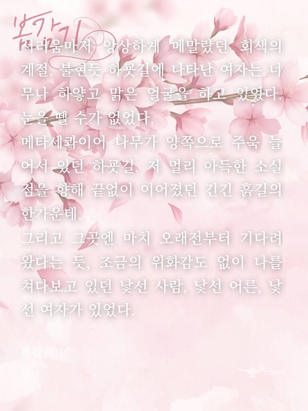 봄쌀님의 전작과는 또 다른 매력이 느껴지던 작품. 총 6권의 걸쳐 장편으로 써졌는데 이 소설의 임소하와 연희재의 관계 진전은 천천히 진행되는 편이고 섬세하면서도 세밀하게 차분한 두 사람의 감정선을 보여줍니다. 소하와 희재가 가족으로 시작하게 된 계기가 어둡고 무거운 사연으로 시작된만큼 서로가 더 조심스럽게 조금씩 다가서는 걸 그려냅니다. 이런 요소들이 이 작품의 매력이기도 하고요. 부모를 어릴 때 모두 잃고 혼자가 되어버린 임소하.. 그리고 자신의 첫사랑이었던 여자의 딸인 소하를 데려와 키우는 연희재 이 소설의 도입부는 소하와 희재의 시점을 번갈아가며 첫 인연의 이야기를 보여줍니다. 이점도 인상적이었던 프롤로그.. 소하가 가족을 잃고 혼자가 된 아픔에서 손을 내밀어 가족이 되어준 희재 그렇게 시작하게 된 두 사람이 사랑하기까지의 그 과정을 차분하면서도 잔잔하게 그려낸 작품 <봄감기>