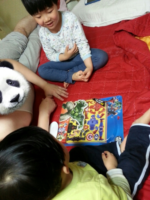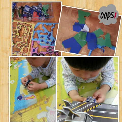 엄마와 같이 열심히 만들어봐요. 4세 꼬맹이가 조각들을 몽땅 판에서 분리해놓는 바람에 ㅡ.ㅡ;; 조각 찾아가며 하나씩ᆢ. 개중엔 다소 찢어진 것도 ㅜㅜ , 헐크의 찢어진 피부는 스카치테이프로 치료해주고ᆢ 6세 맹이는 엄마말듣고 열심히 끼워봅니다. 비행기 날개는 동일한거 4개니까 혼자 만들고 있구요 ^^