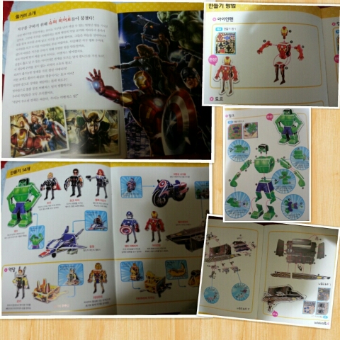 가위도 필요없이 그냥 손으로 뜯어내 접고 홈사이를 번호순서대로 꽂아 주기만 하면 멋진 영웅들과 무기들, 헬기캐리어, 비행기 뿐만 아니라 악당들까지 만들 수 있어요. 완전 멋지지 않나요? 제법 단단해 갖고 놀기도 괜찮습니다. 진짜 캐릭터 역할 놀이 제대로 할수있겠어요 !!! ㅎㅎ