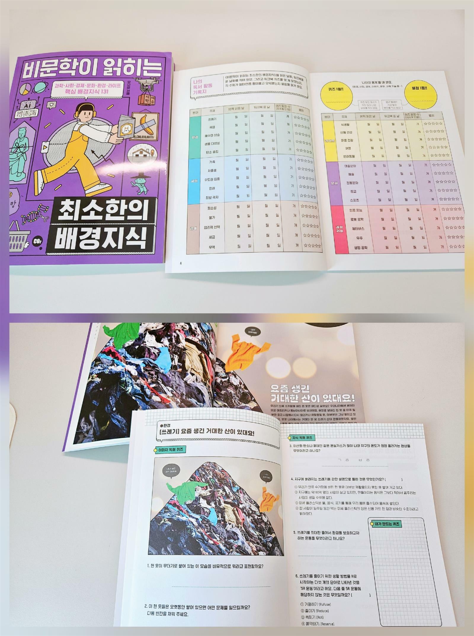 비문학 독해가 중요하긴 한데 아이가 비문학은 어려워서 잘 안읽을려고 하더라고요 그런데 이 책은 딱 아이가 좋아할만한 쉽고 재밌는 비문학 독해책인것 같아 준비해봤는데 역시나 아이가 너무 좋아하네요~ <비문학이 읽히는 최소한의 배경지식>은 대입 논술, 수능 비문학 지문에 나오는 가장 중요한 주제를 골라 어린이의 눈높이에 맞는 최신 토픽으로 풀어내고, 잡지식 구성으로 각 주제를 생생하고 유쾌하게 보여 주는 사진과 그림을 과감하게 배치해 토픽 내용을 시각적으로도 한 번 더 재미있게 익힐 수 있어요 길고 지루한 지문이 아닌 시각적으로 호기심을 자극하고 내용을 쉽게 이해할 수 있는 비문학책이다보니 아이가 확실히 흥미로워하고 스스로 먼저 찾아 보더라고요 초등 3~6학년 국어, 사회, 과학과 교과 연계되어 교과서 개념 다지기도 좋고 워크북까지 함께 구성되어 있어 배경지식을 다시 한번 단단하게 다질 수 있답니다~ 비문학 어려워하는 아이도 재밌게 시작할 수 있는 책이라 추천하고 싶습니다~! ※ 출판사로부터 도서를 제공받아 솔직하게 작성한 후기입니다