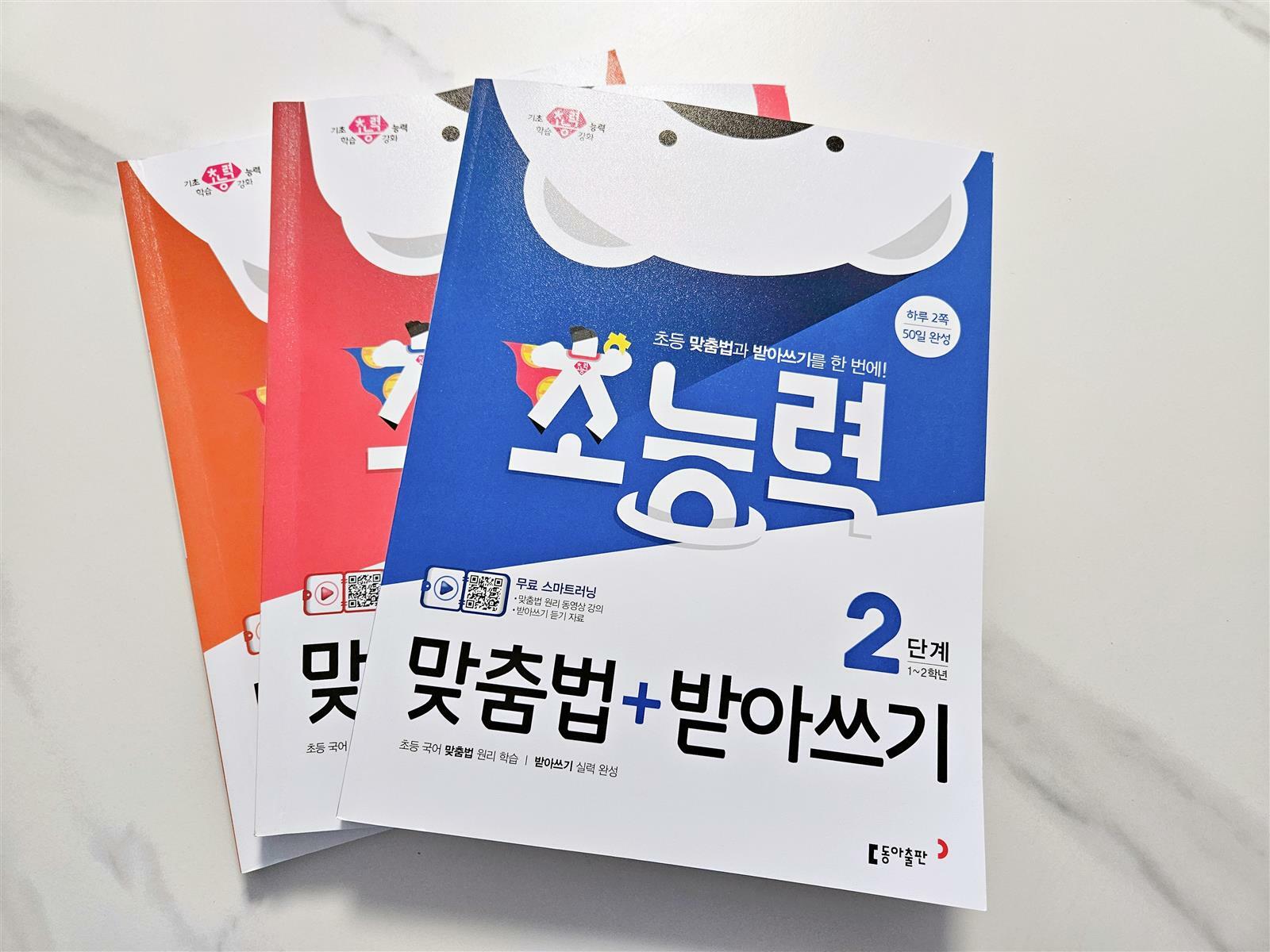 초능력 맞춤법+받아쓰기 시리즈 아이가 7살 예비초등일때P단계부터 시작해서 1~2학년 1단계까지 학습했는데 이번 방학엔 이어서 1~2학년 2단계 시작해봤어요~ 초능력 맞춤법+받아쓰기는 예비초등때 한글 가르치려고 선택했던 교재인데 이 책을 고른 이유는 틀리기 쉬운 맞춤법 받아쓰기를 한번에 학습할 수 있고 아이가 쓰는걸 좀 싫어해서 반복적으로 쓰기만 하는 방식의 교재들은 너무 힘들어하더라고요 초능력 맞춤법+받아쓰기는 하루 2쪽 구성인데 내용이 크게 부담없고 지루하지 않으면서 틀리기 쉬운 맞춤법 교정에 좋아서 맘에 들었어요 2단계는 겹받침이나 어른들도 헷갈리기 쉬운 잘못쓰기 쉬운 말 등을 다루는데 맞춤법 거의 마지막 단계로 완벽하게 한글 떼는용으로 좋은 것 같아요 동아출판 교재들은 무료 스마트러닝이 제공되서 엄마표 학습 교재로 참 좋은데요 맞춤법 강의가 제공되서 아이 스스로 공부할때도 좋고 받아쓰기 듣기 자료로 받아쓰기 연습하기도 참 좋아요! 아이가 읽고 쓰고 왠만큼 하는데 확실히 쓰는것과 다르게 소리나는 낱말들을 많이 헷갈려하더라고요 초능력 맞춤법+받아쓰기로 학습하며 우리 아이 맞춤법 실력도 많이 늘 것 같아요~
