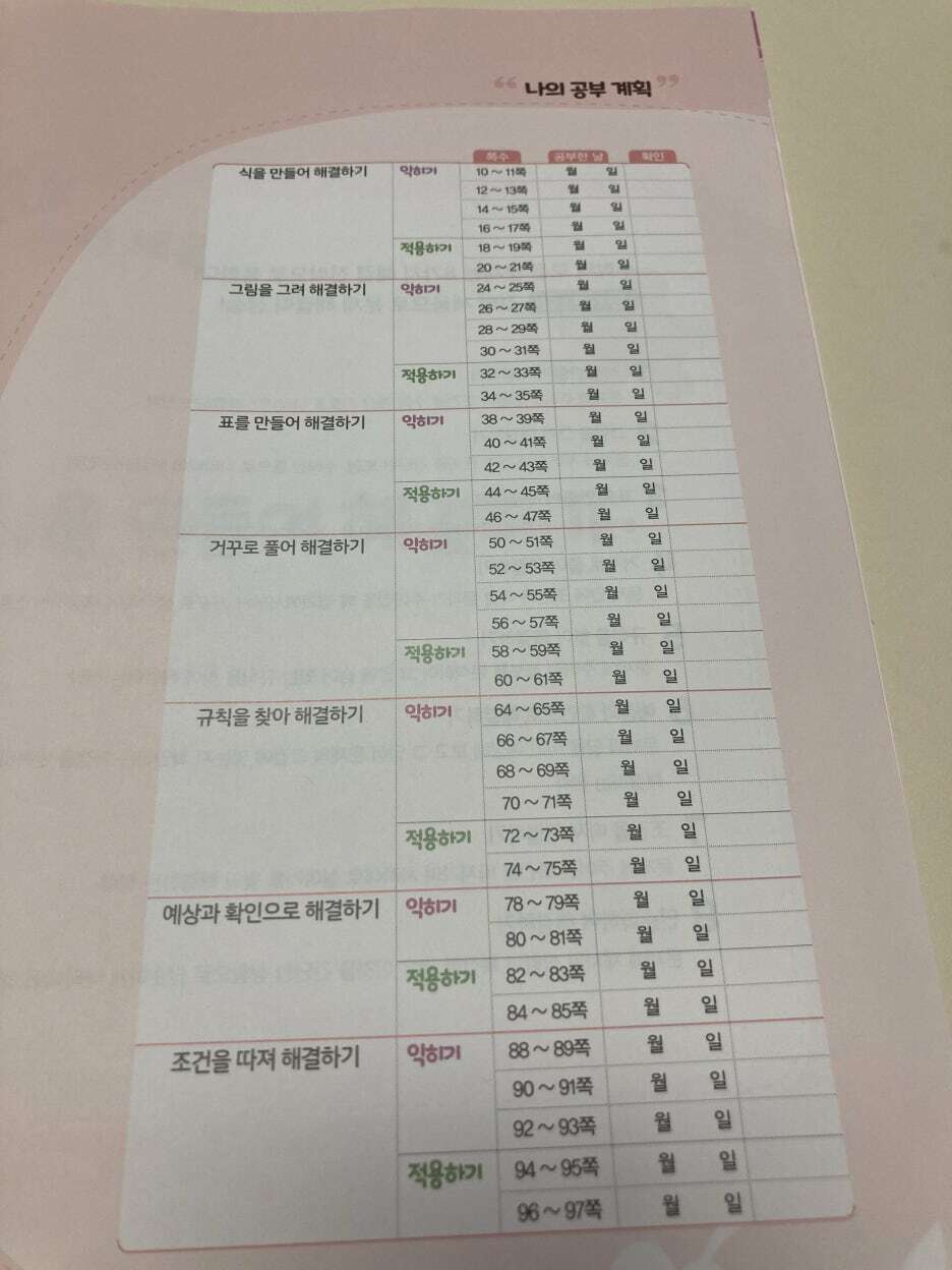 나의 공부계획에서 날짜를 쓰고 그날 해당하는 쪽수를 풀면 되는데 전략 세움의 경우는 정말 워밍업을 하기 위한 문제이다보니 정말 부담없이 풀 수 있습니다. 하루에 한장이거든요.
