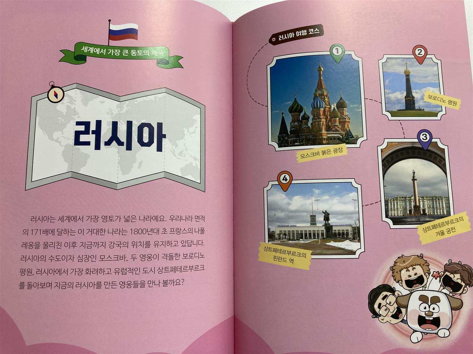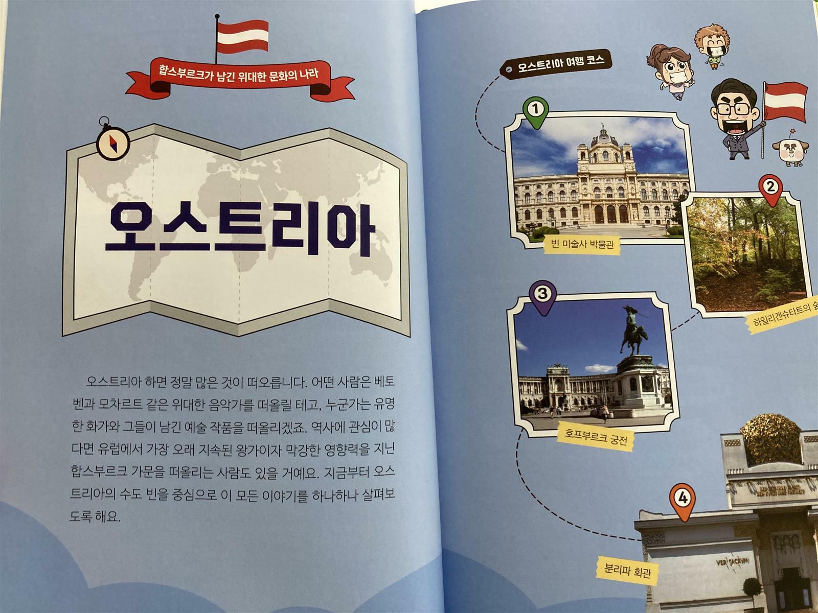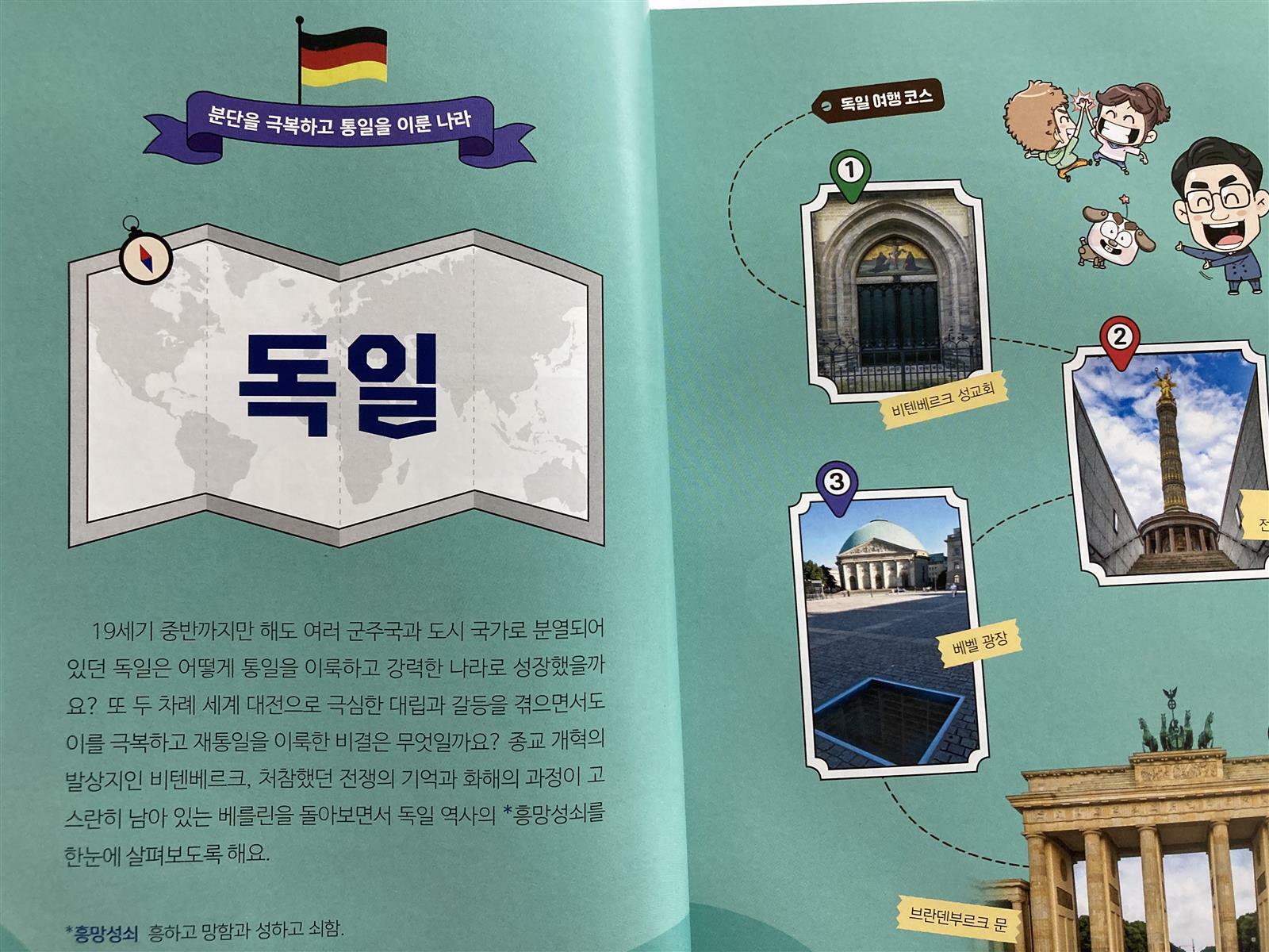 각 나라의 랜드마크라고 할 수 있는 유명한 장소들과 그 나라의 유명한 인물들을 사진과 설명으로 알아보게 됩니다. 각 장소에서 과거에 어떤 사건이 벌어졌는지 알 수 있고, 그것이 현재에 와서 어떤 의미를 지니는지 생각해보게 되면서 세계사에 대한 자신만의 관점을 키울 수 있네요.