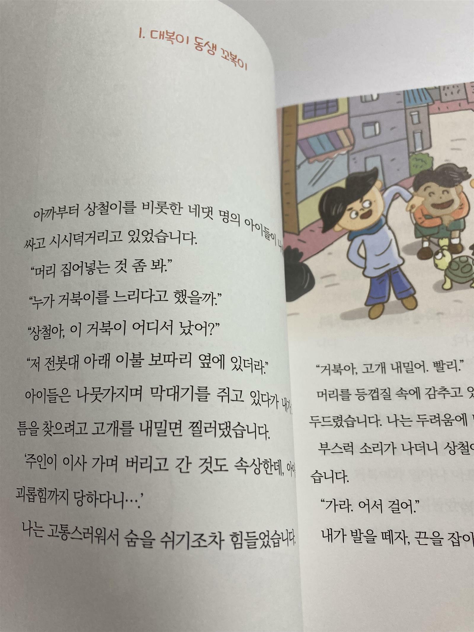 주인이 이사가면서 버려진 주인공 꼬복이는 원래 이름은 꼬복이가 아니고 이름없는 거북이였어요.